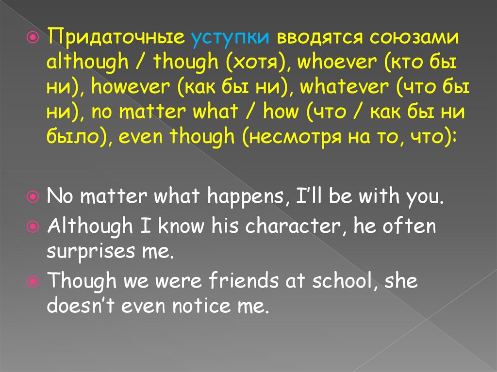 Придаточные уступки вводятся союзамиalthough / though (хотя), whoever (кто бы