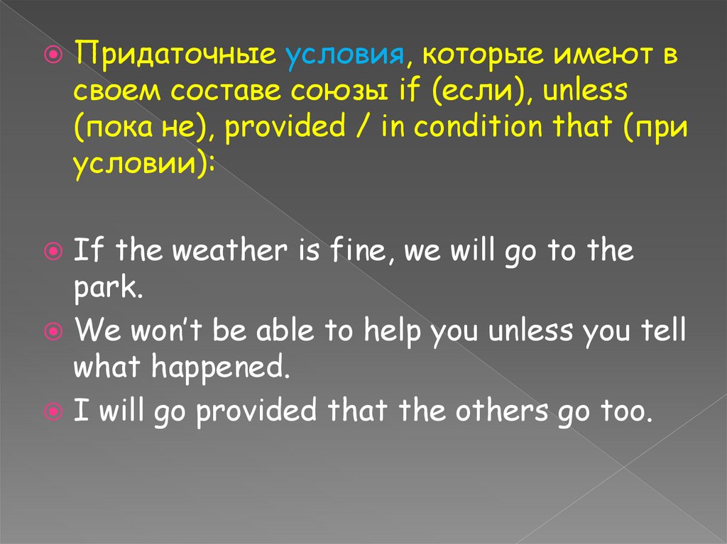 Придаточные условия, которые имеют всвоем составе союзы if (если), unless