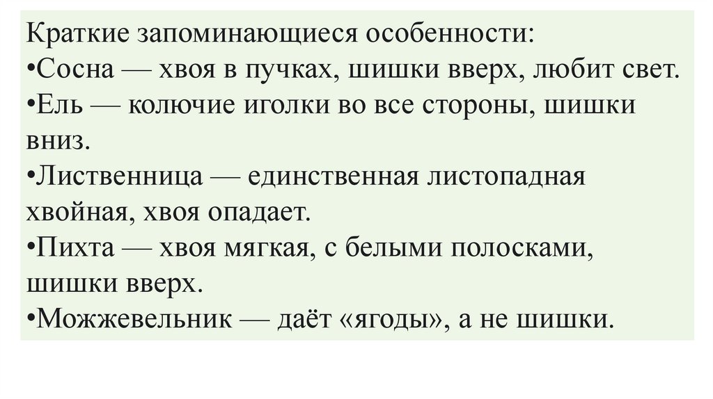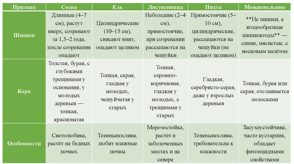 Краткие запоминающиеся особенности:•Сосна — хвоя в пучках, шишки вверх, любит свет.