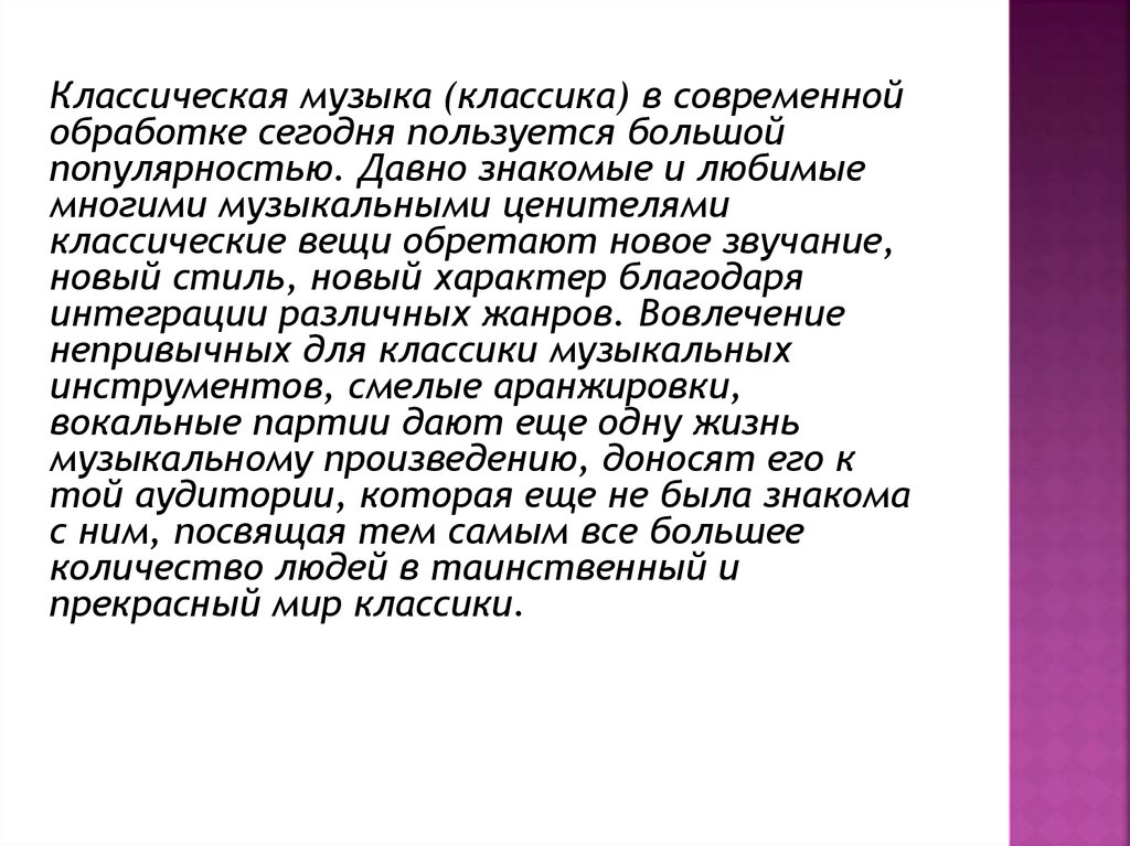 Классическая музыка (классика) в современнойобработке сегодня пользуется большой
