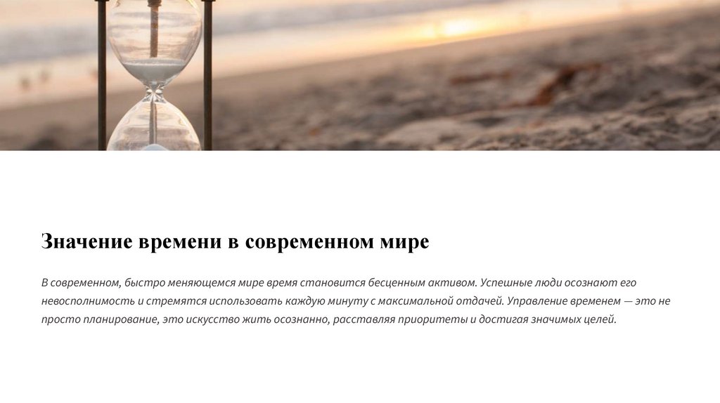 Значение времени в современном миреВ современном, быстро меняющемся мире время становится бесценным активом. Успешные люди осознают его
