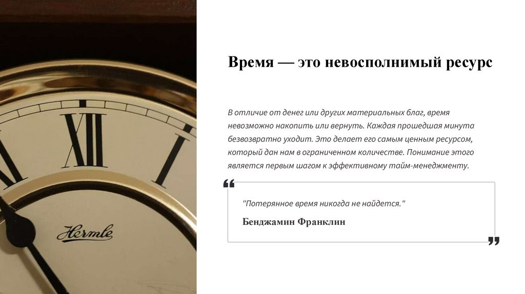 Время — это невосполнимый ресурсВ отличие от денег или других материальных благ, время