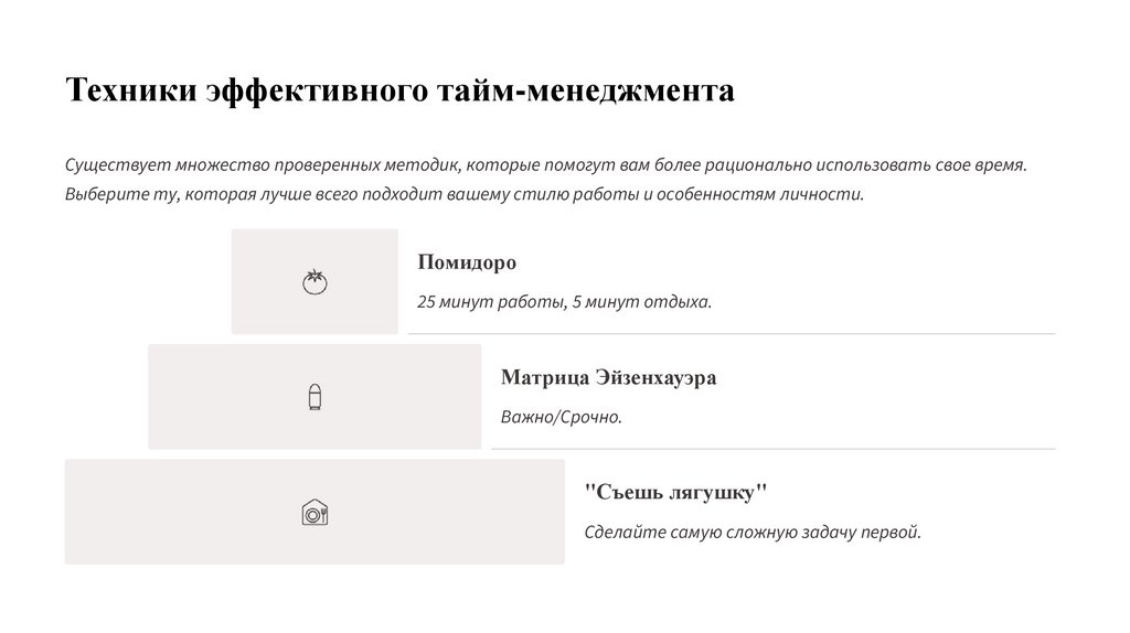 Техники эффективного тайм-менеджментаСуществует множество проверенных методик, которые помогут вам более рационально использовать свое время.