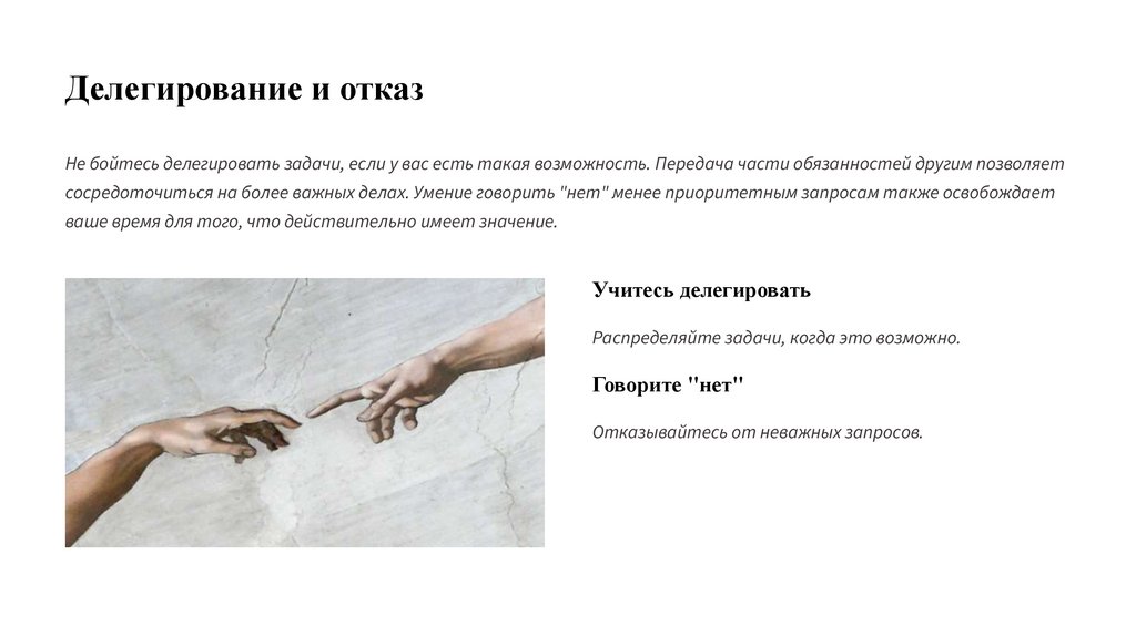 Делегирование и отказНе бойтесь делегировать задачи, если у вас есть такая возможность. Передача части обязанностей другим позволяет