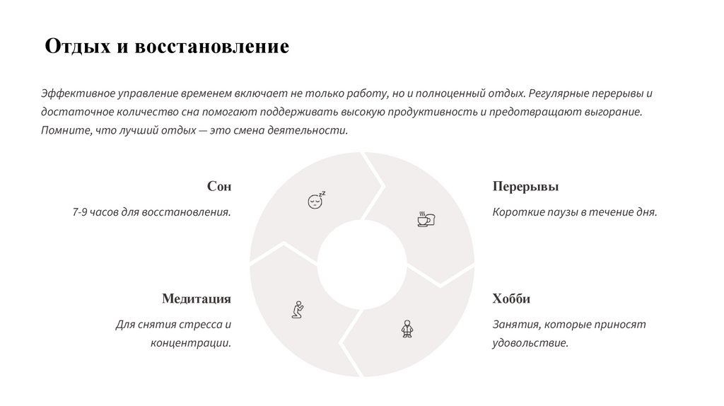 Отдых и восстановлениеЭффективное управление временем включает не только работу, но и полноценный отдых. Регулярные перерывы и