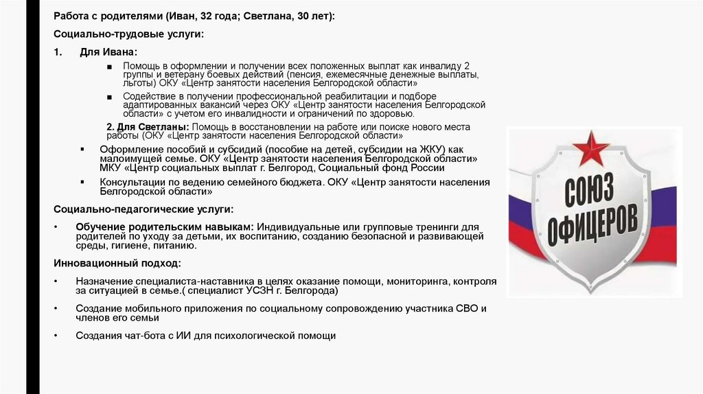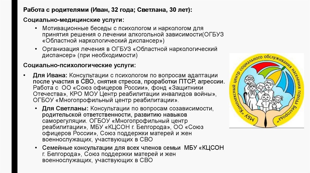Работа с родителями (Иван, 32 года; Светлана, 30 лет):Социально-трудовые услуги: