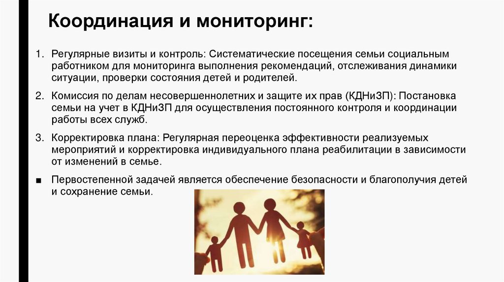1. Регулярные визиты и контроль: Систематические посещения семьи социальнымработником для мониторинга выполнения рекомендаций, отслеживания динамики