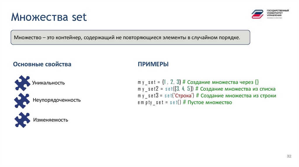 m y _ s e t = {1 , 2 , 3} # Создание множества через {}