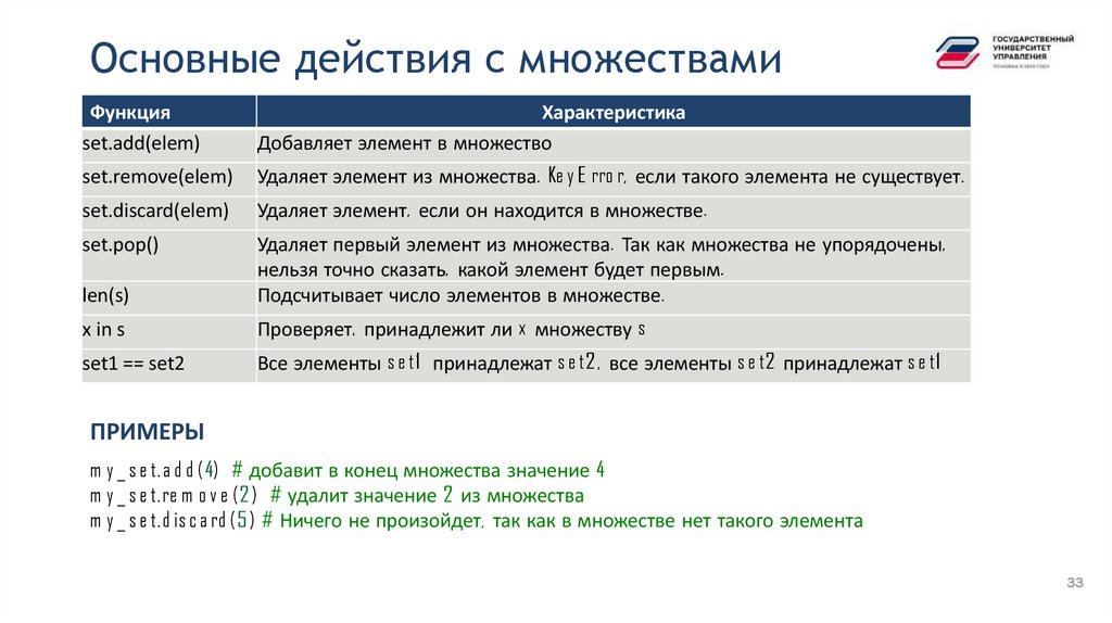m y _ s e t. re m o v e (2 ) # удалит значение 2 из множества