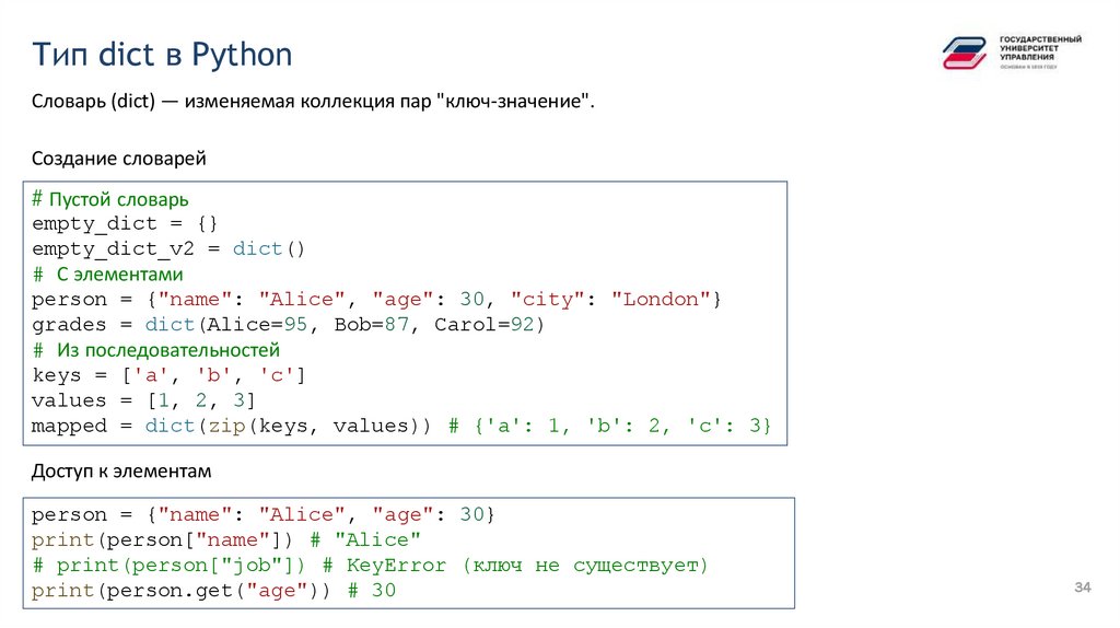 Словарь (dict) — изменяемая коллекция пар "ключ-значение".Создание словарей