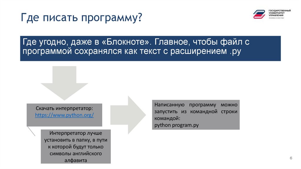 Где угодно, даже в «Блокноте». Главное, чтобы файл спрограммой сохранялся как текст с расширением .py