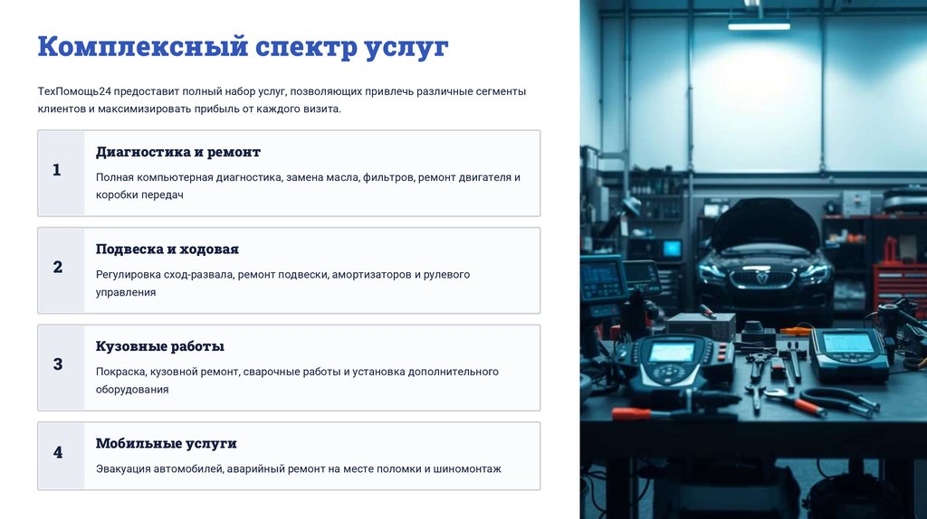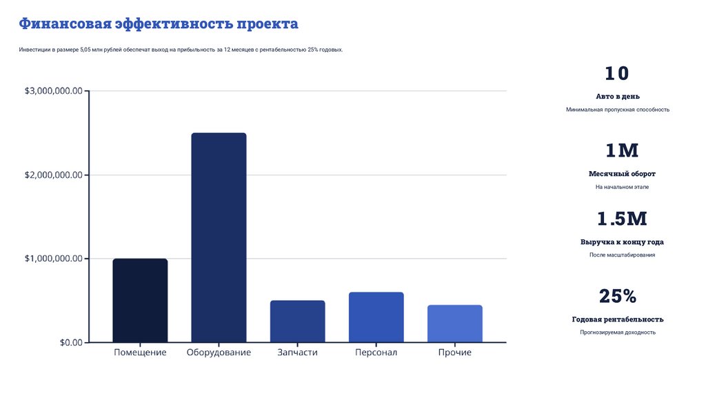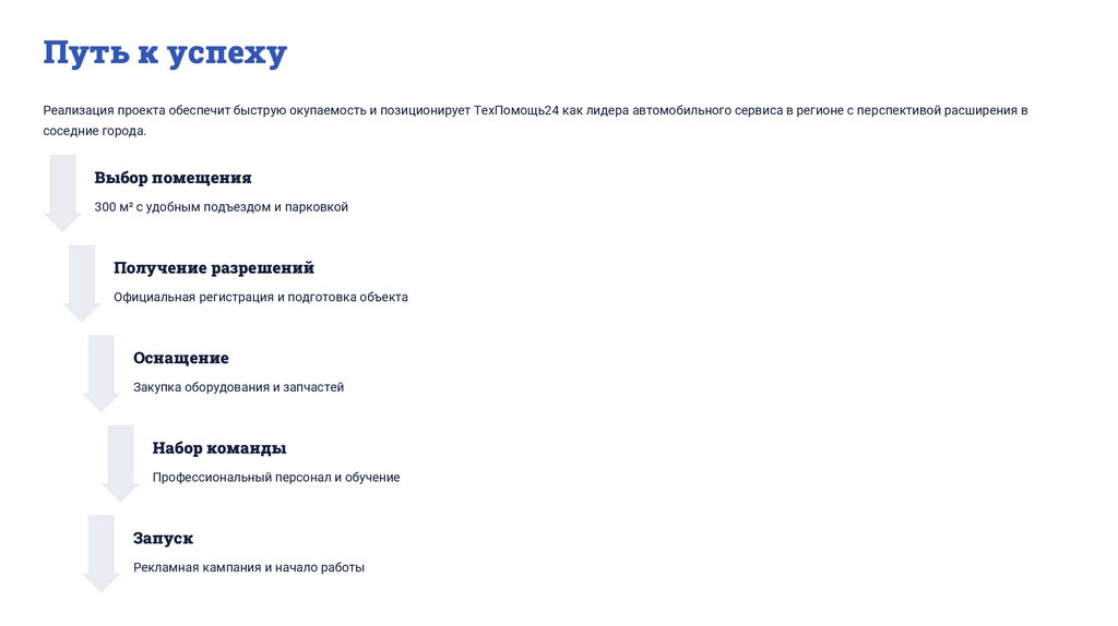 Путь к успехуРеализация проекта обеспечит быструю окупаемость и позиционирует ТехПомощь24 как лидера автомобильного сервиса в регионе с перспективой расширения в