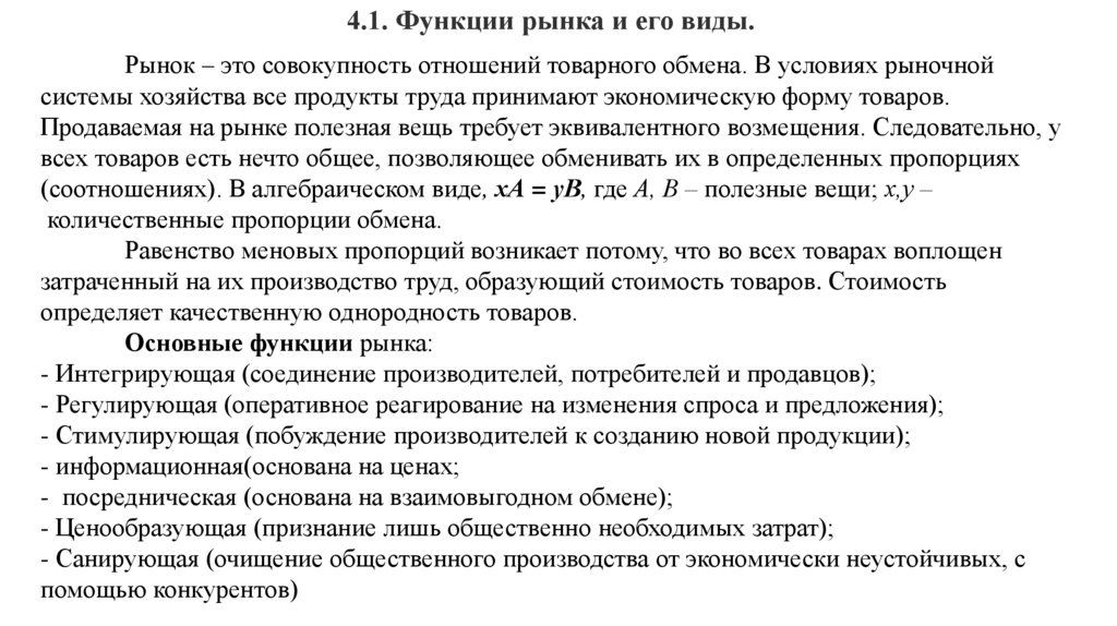 4.1. Функции рынка и его виды.Рынок – это совокупность отношений товарного обмена. В условиях рыночной