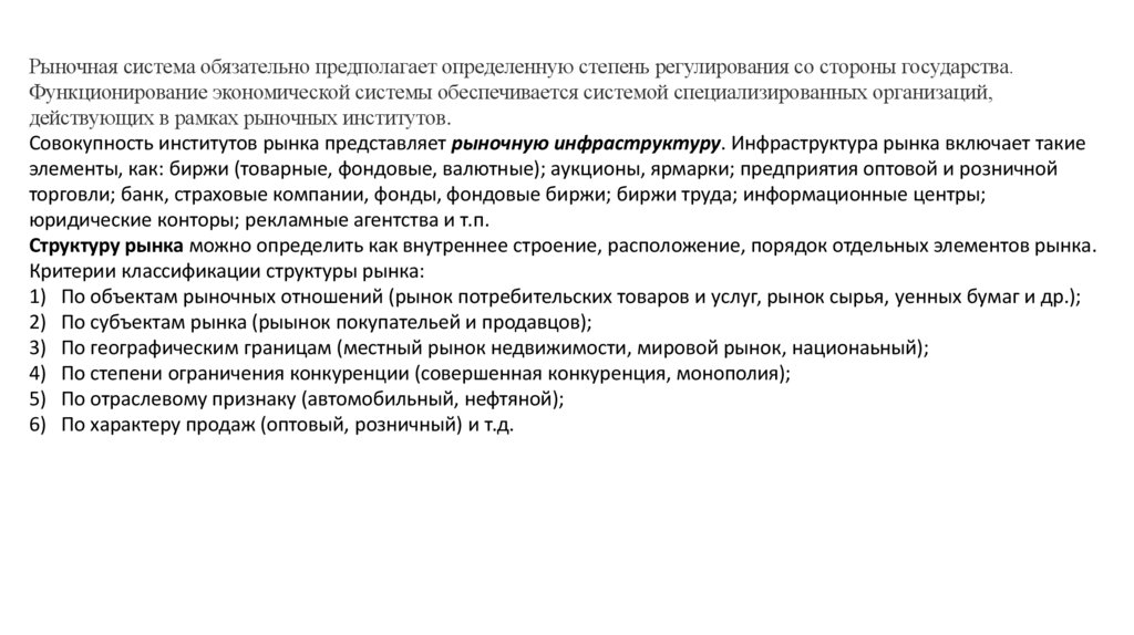 Совокупность институтов рынка представляет рыночную инфраструктуру. Инфраструктура рынка включает такие