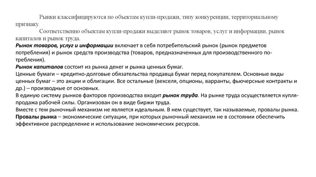 Рынки классифицируются по объектам купли-продажи, типу конкуренции, территориальномупризнаку.