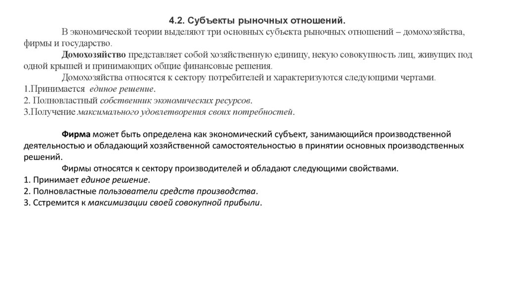 4.2. Субъекты рыночных отношений.В экономической теории выделяют три основных субъекта рыночных отношений – домохозяйства,