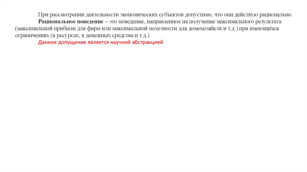 При рассмотрении деятельности экономических субъектов допустимо, что они действую рационально.Рациональное поведение – это поведение, направленное на получение максимального результата