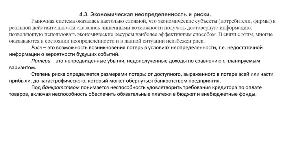4.3. Экономическая неопределенность и риски.Рыночная система оказалась настолько сложной, что экономические субъекты (потребители, фирмы) в