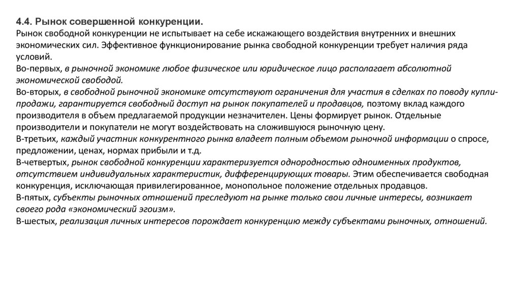 4.4. Рынок совершенной конкуренции.Рынок свободной конкуренции не испытывает на себе искажающего воздействия внутренних и внешних