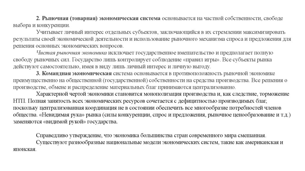 2. Рыночная (товарная) экономическая система основывается на частной собственности, свободевыбора и конкуренции.