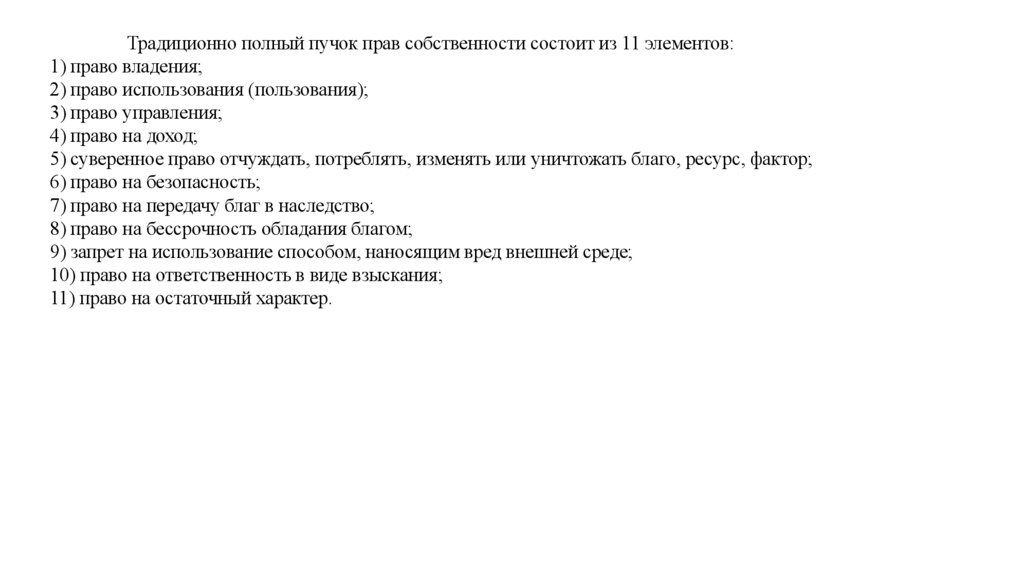 Традиционно полный пучок прав собственности состоит из 11 элементов:1) право владения;