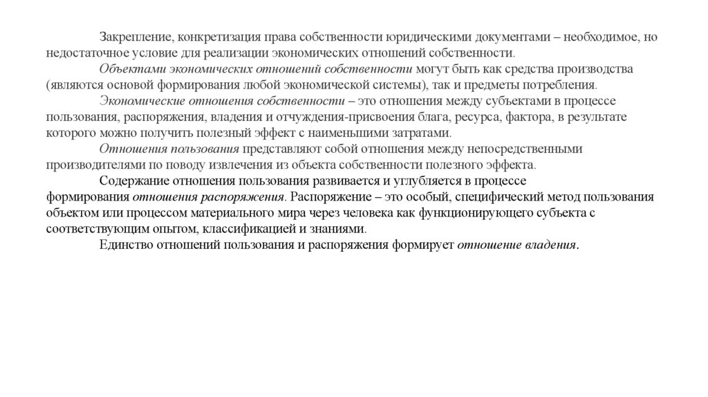 Закрепление, конкретизация права собственности юридическими документами – необходимое, нонедостаточное условие для реализации экономических отношений собственности.