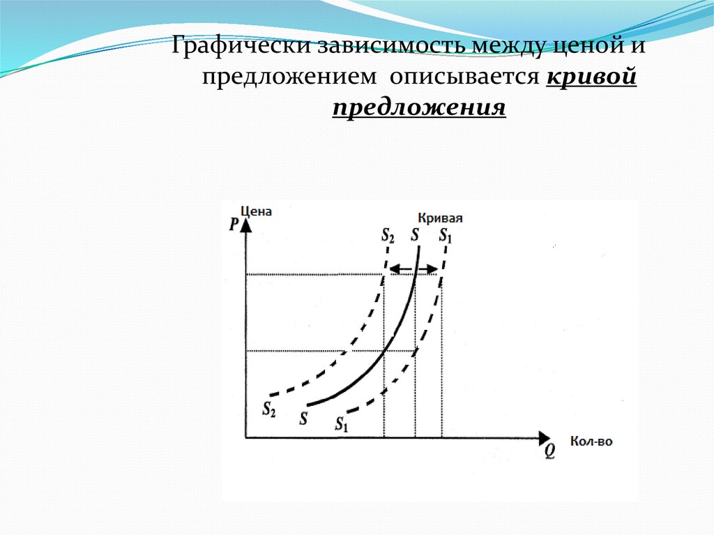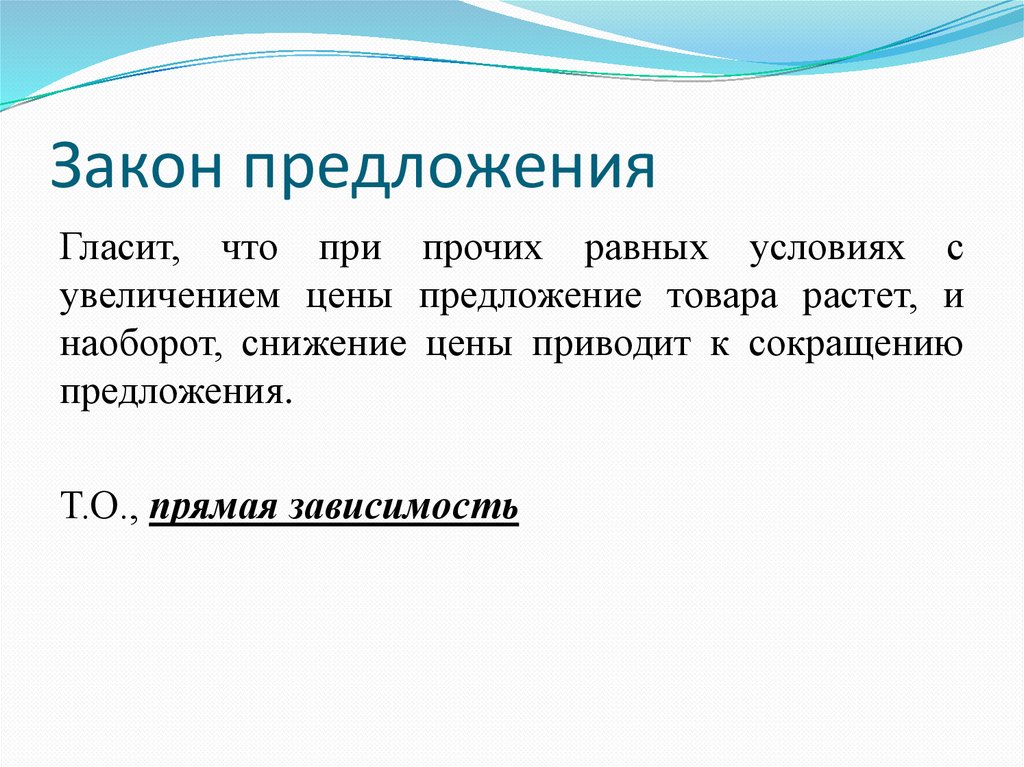 Гласит, что при прочих равных условиях сувеличением цены предложение товара растет, и