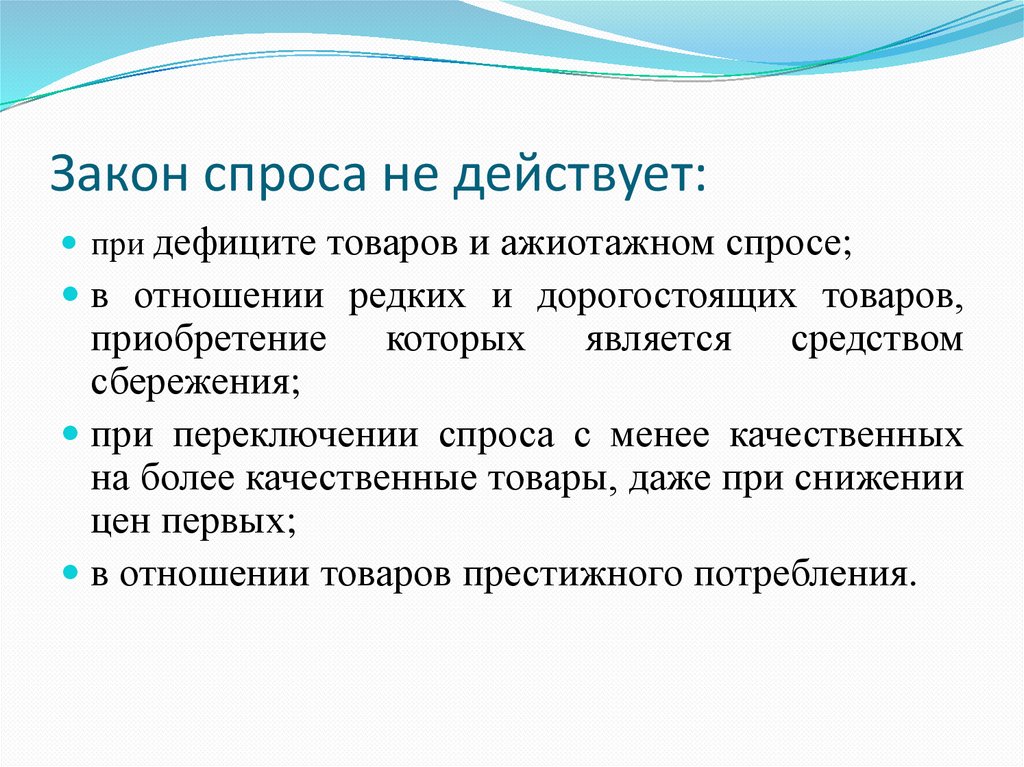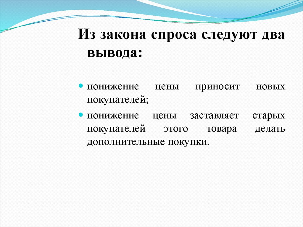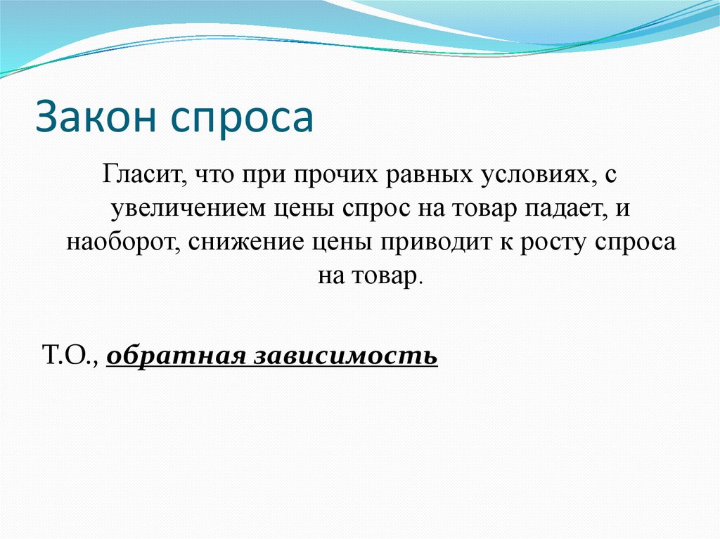 Гласит, что при прочих равных условиях, сувеличением цены спрос на товар падает, и