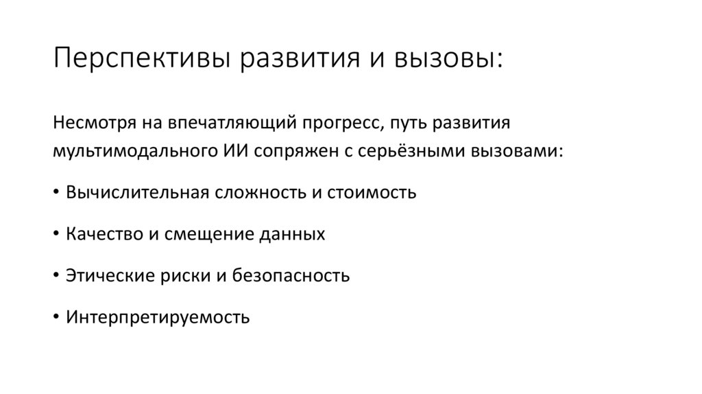 Несмотря на впечатляющий прогресс, путь развитиямультимодального ИИ сопряжен с серьёзными вызовами: