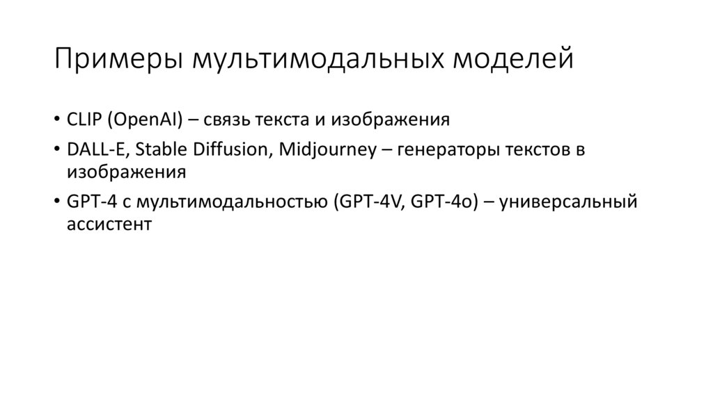 • CLIP (OpenAI) – связь текста и изображения• DALL-E, Stable Diffusion, Midjourney – генераторы текстов в