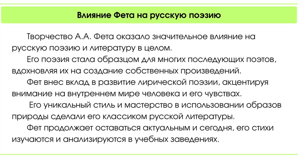 Влияние Фета на русскую поэзиюТворчество А.А. Фета оказало значительное влияние на