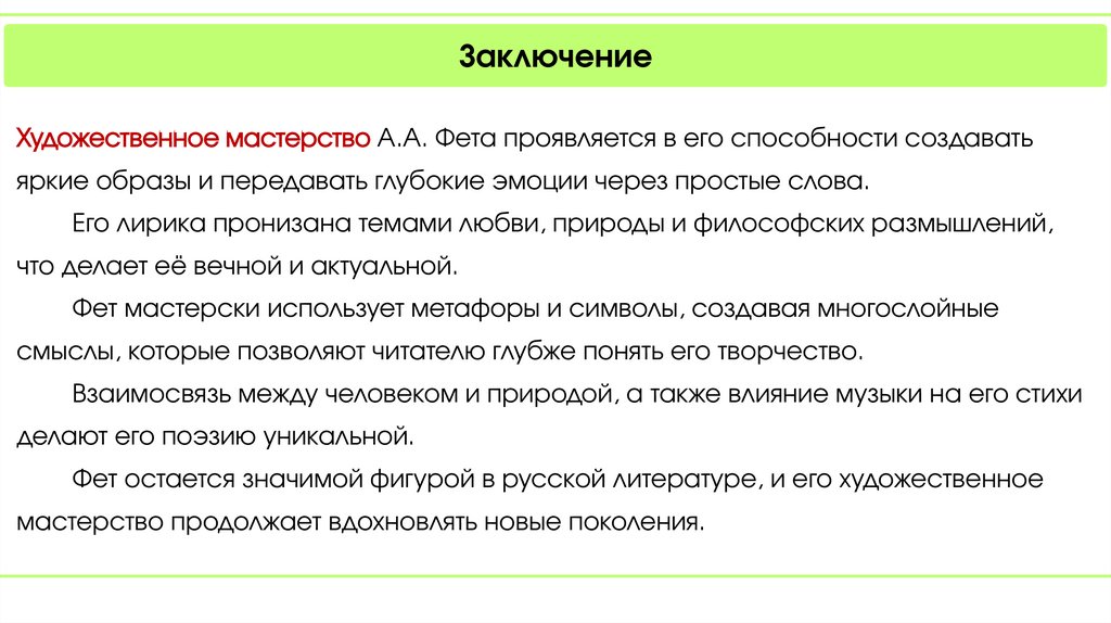 ЗаключениеХудожественное мастерство А.А. Фета проявляется в его способности создавать