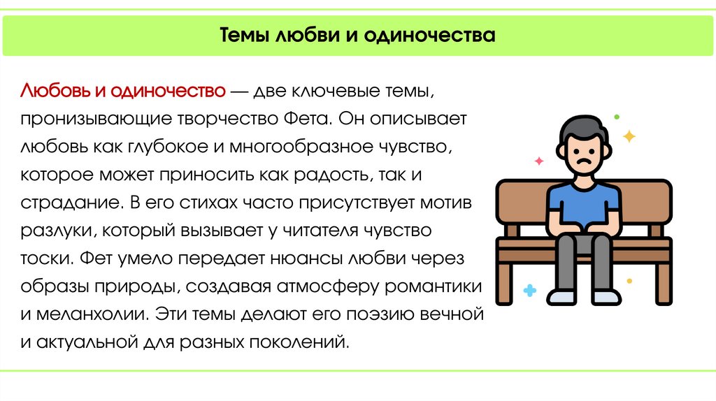 Темы любви и одиночестваЛюбовь и одиночество — две ключевые темы,