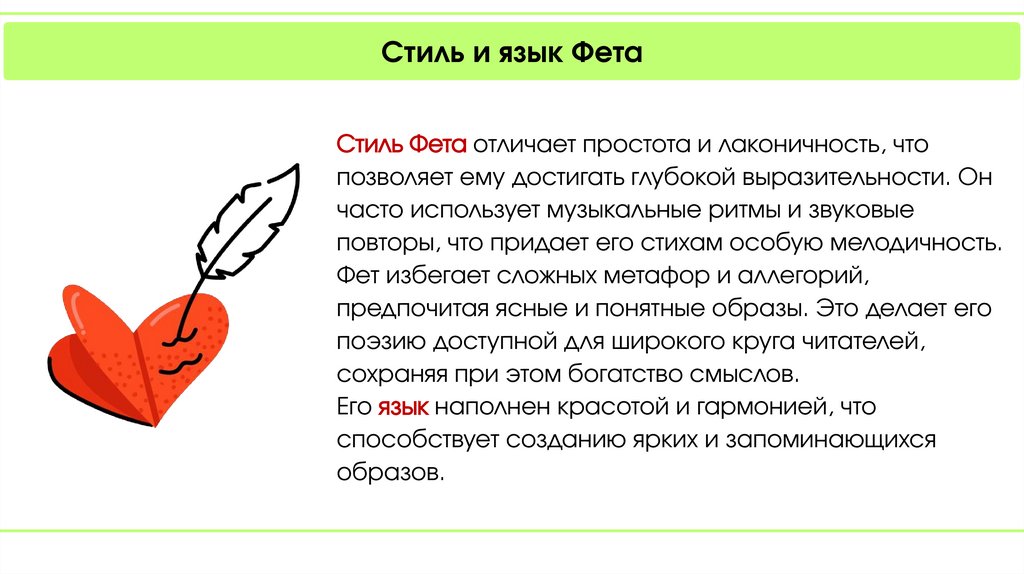 Стиль и язык ФетаСтиль Фета отличает простота и лаконичность, что
