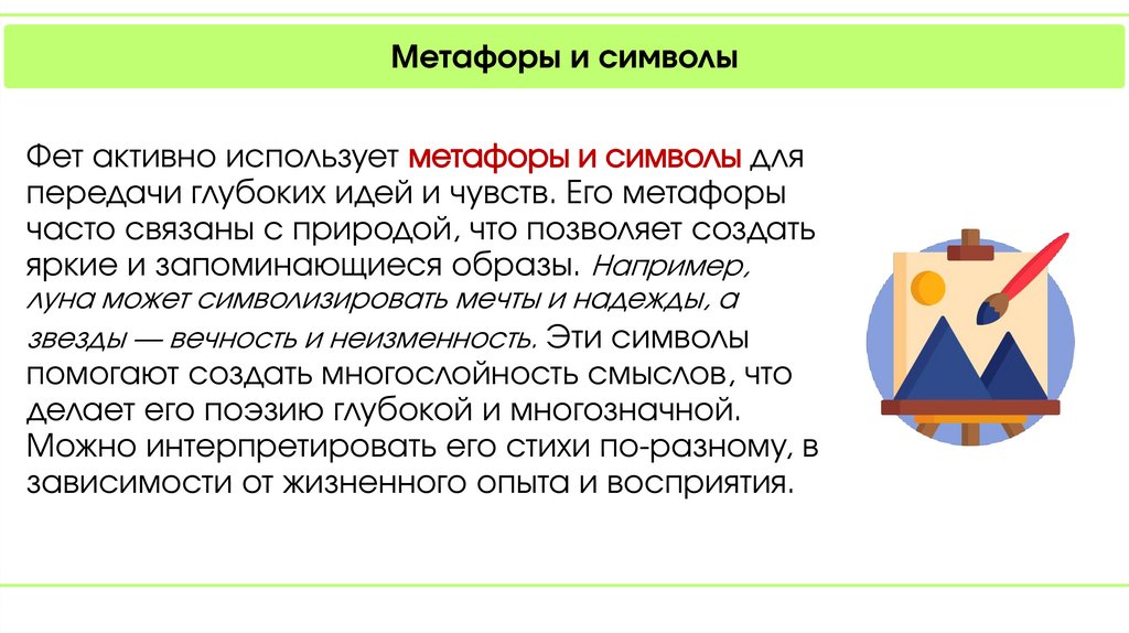 Фет мастерски использует метафоры и символы, создавая многослойные
