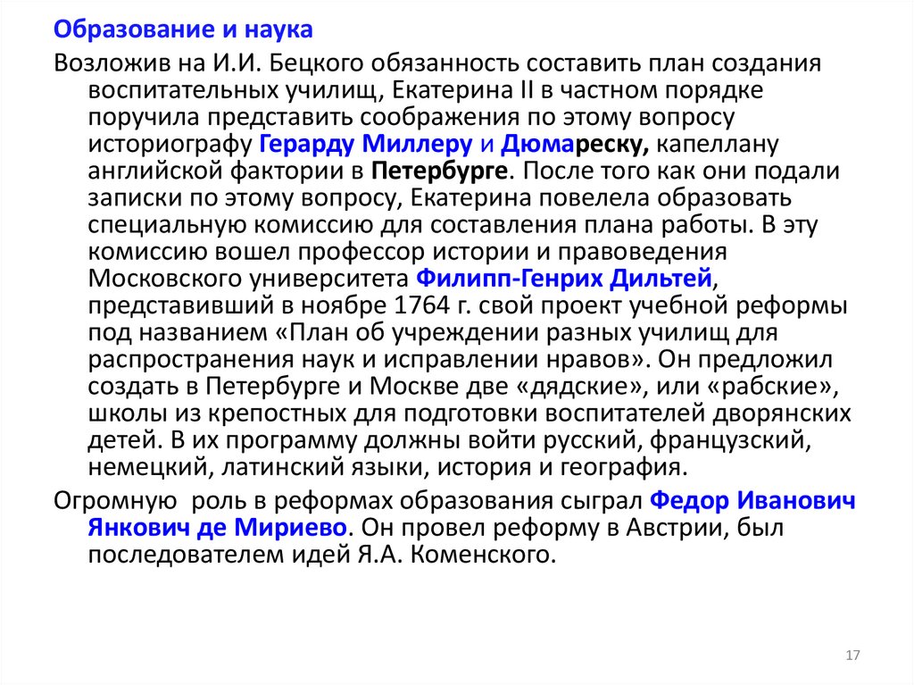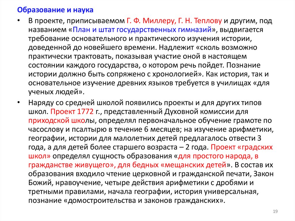 Образование и наука• В проекте, приписываемом Г. Ф. Миллеру, Г. Н. Теплову и другим, под