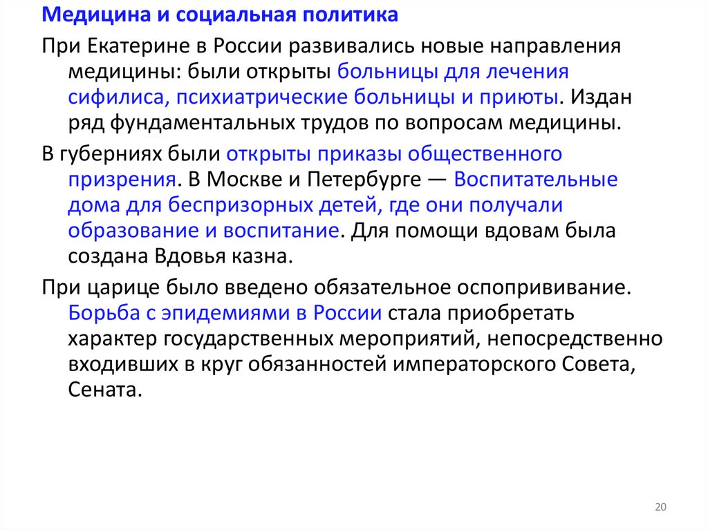 Медицина и социальная политикаПри Екатерине в России развивались новые направления
