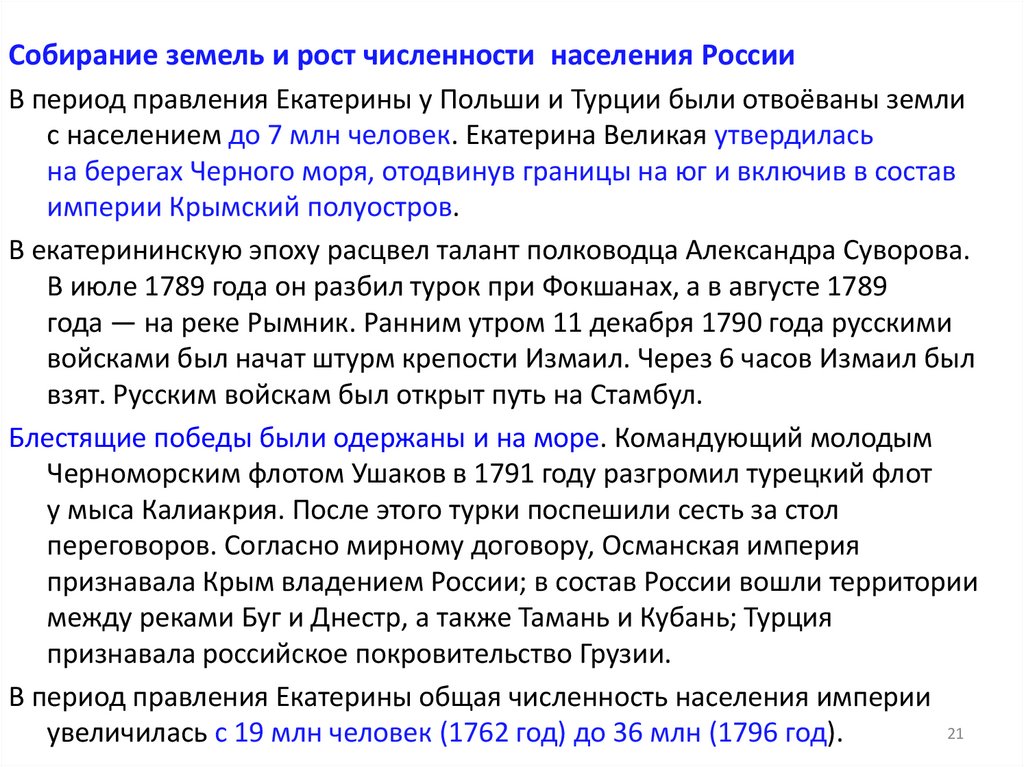 Собирание земель и рост численности населения РоссииВ период правления Екатерины у Польши и Турции были отвоёваны земли