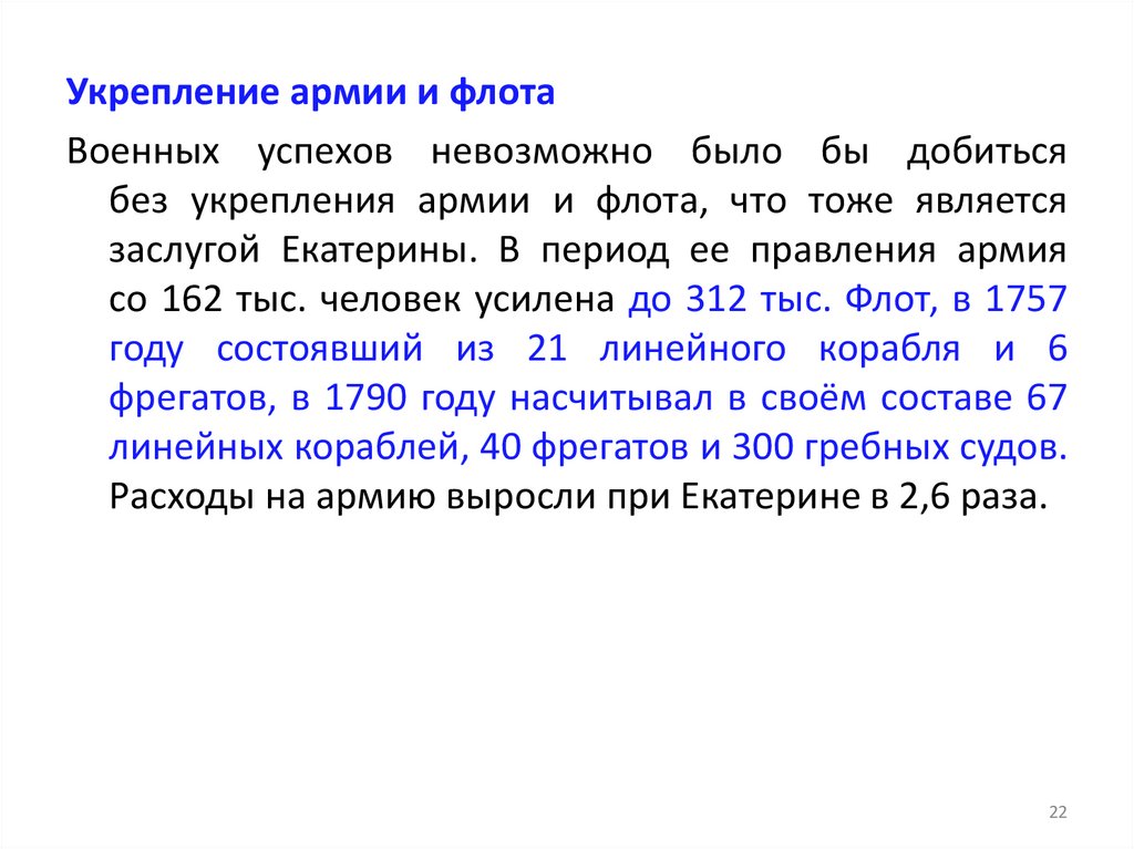 Расходы на армию выросли при Екатерине в 2,6 раза.