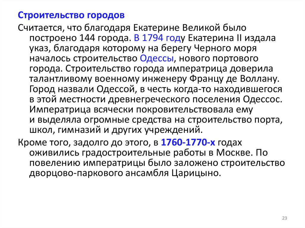 Строительство городовСчитается, что благодаря Екатерине Великой было