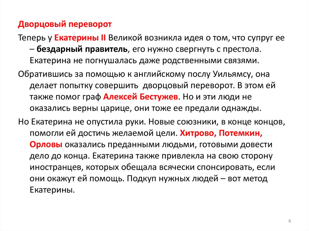 Дворцовый переворотТеперь у Екатерины II Великой возникла идея о том, что супруг ее