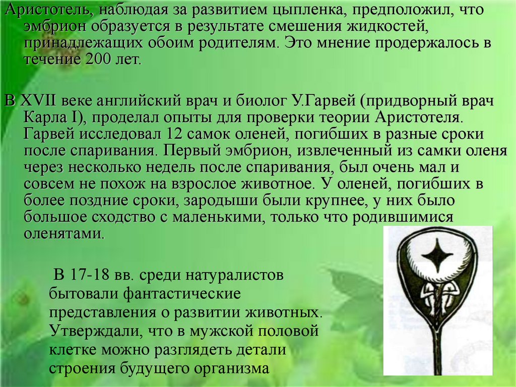 Аристотель, наблюдая за развитием цыпленка, предположил, чтоэмбрион образуется в результате смешения жидкостей,