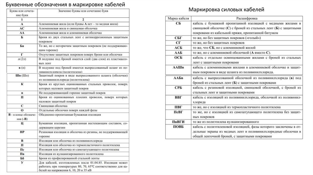 Буквенные обозначения в маркировке кабелейМаркировка силовых кабелей