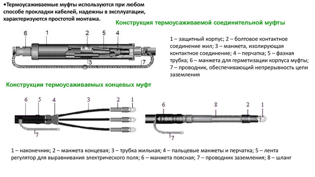 •Термоусаживаемые муфты используются при любомспособе прокладки кабелей, надежны в эксплуатации,