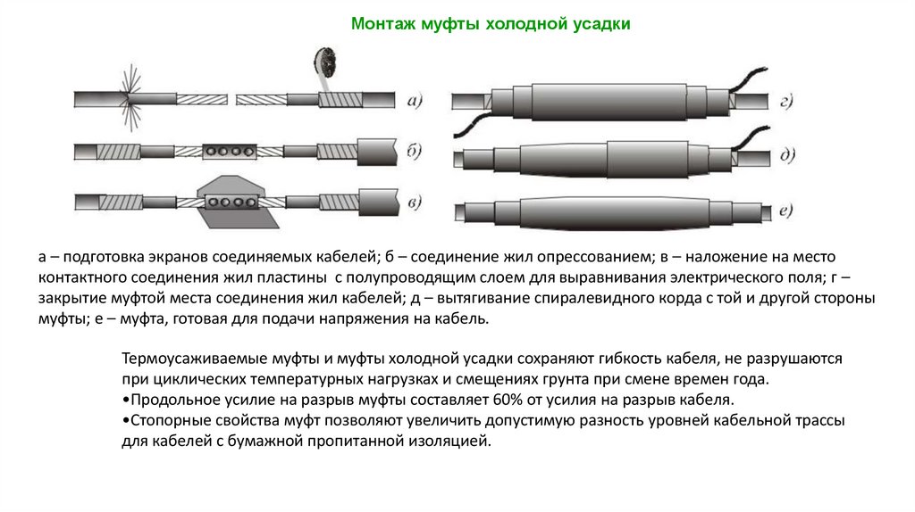 Монтаж муфты холодной усадкиа – подготовка экранов соединяемых кабелей; б – соединение жил опрессованием; в – наложение на место