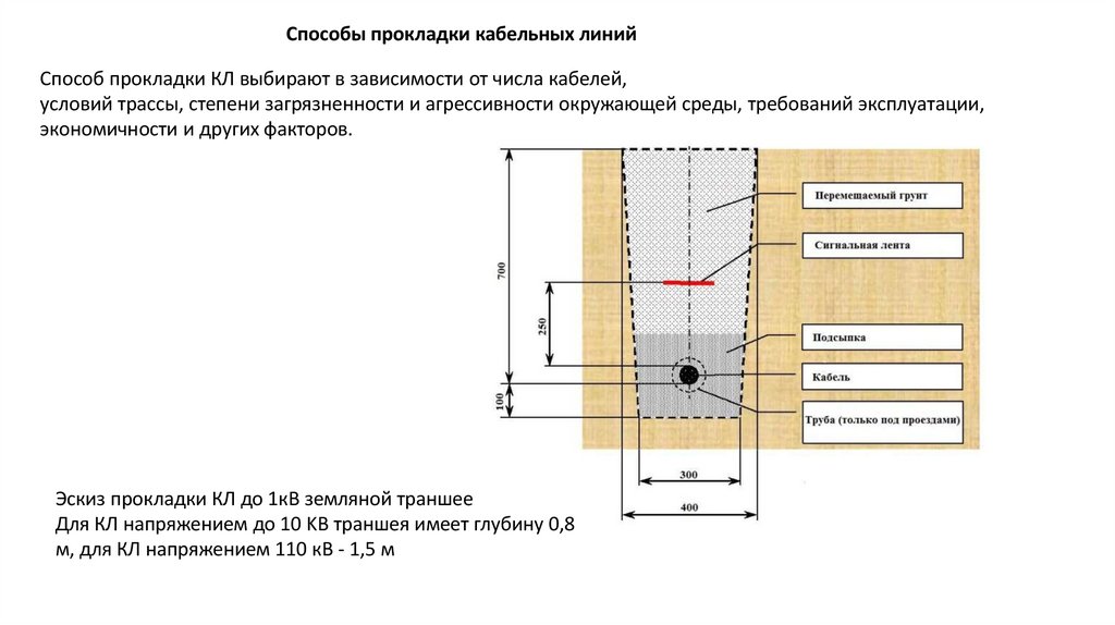 Для КЛ напряжением до 10 KB траншея имеет глубину 0,8