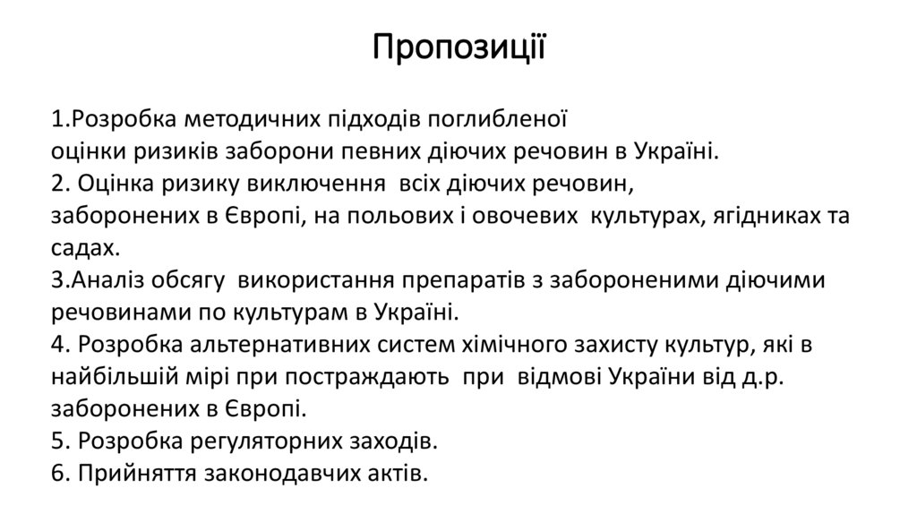 1.Розробка методичних підходів поглибленоїоцінки ризиків заборони певних діючих речовин в Україні.