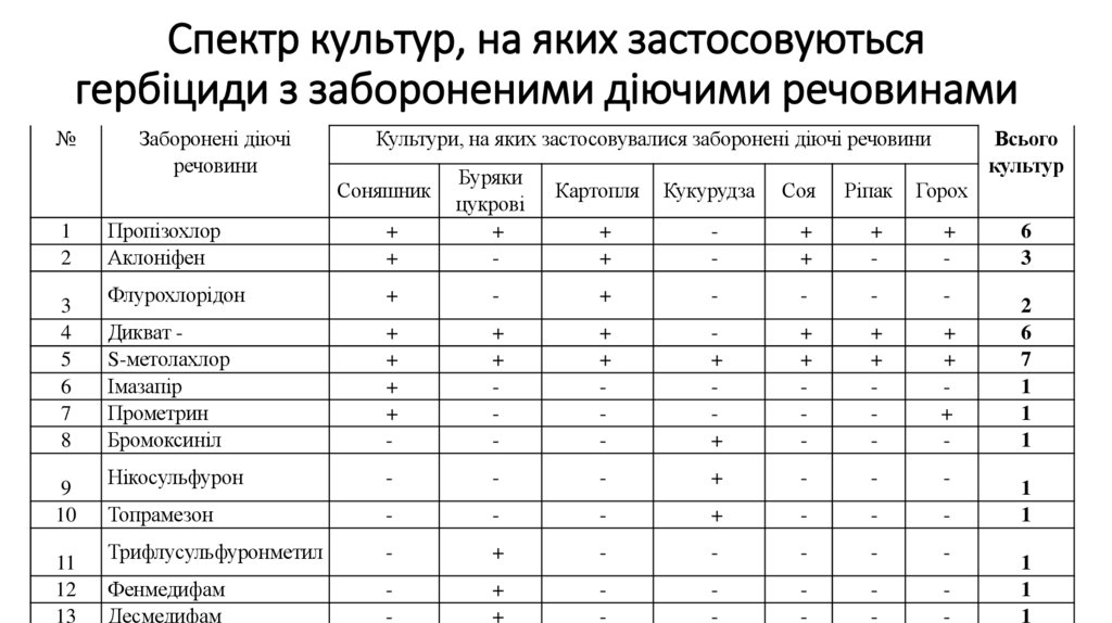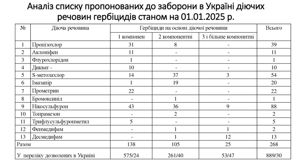 5. Аналіз списку пропонованих до заборони в Україні діючих речовин гербіцидів станом на 01.01.2025 р.