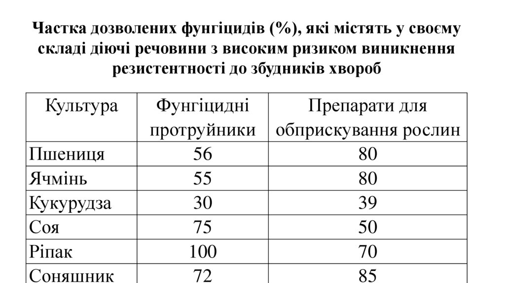 Частка дозволених фунгіцидів (%), які містять у своємускладі діючі речовини з високим ризиком виникнення