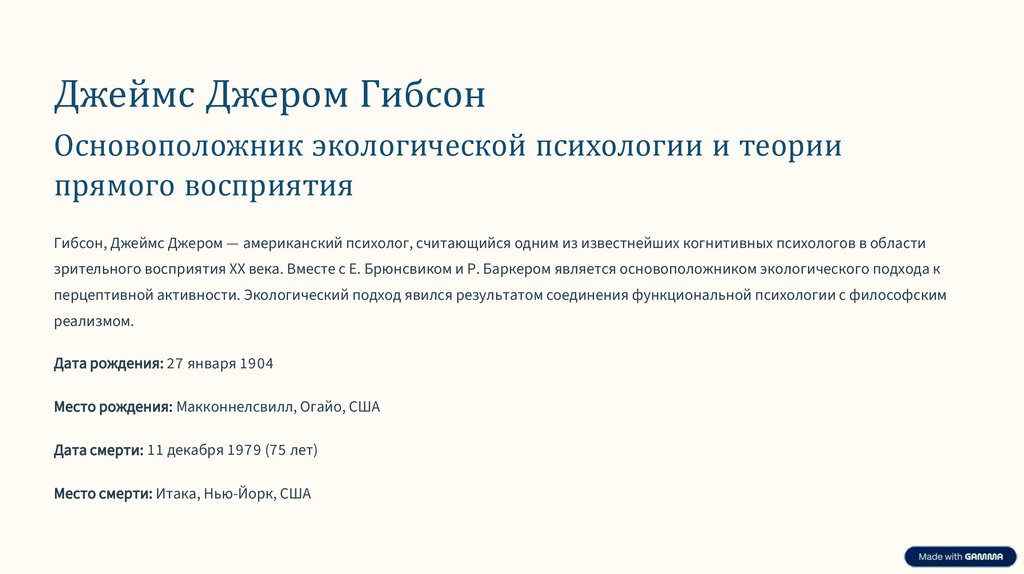 зрительного восприятия XX века. Вместе с Е. Брюнсвиком и Р. Баркером является основоположником экологического подхода к